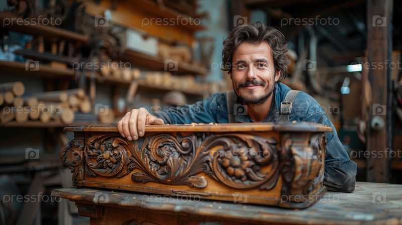 Портрет красивого мастера в своей мастерской, улыбающегося и смотрящего в камеру