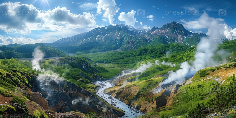 Вид сверху на вулканическую долину с гейзерами и термальными источниками