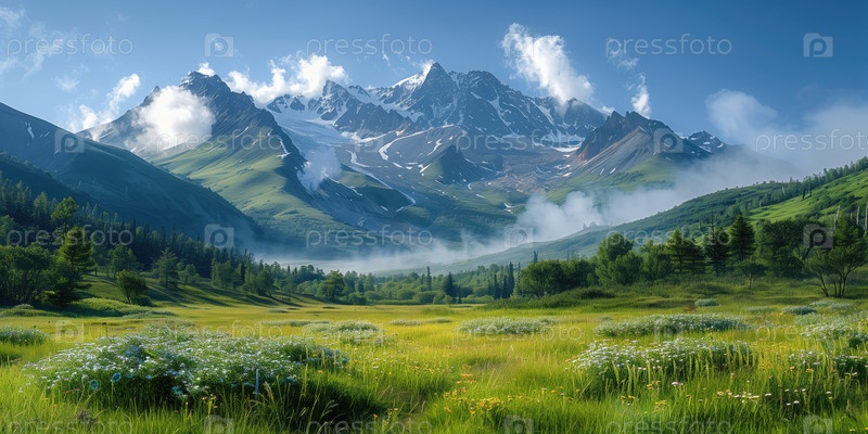 Красивый летний пейзаж в горах. Панорамный вид на цветущую долину