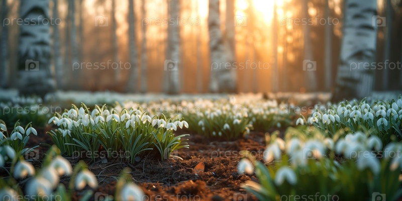 Подснежники цветут в березовой роще на закате