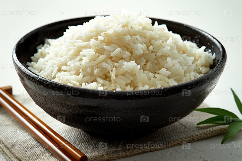 Рис в миске и палочки для еды на белом фоне