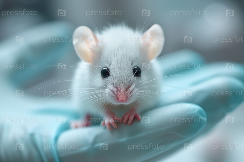 Белая мышь в руках человека в защитных латексных перчатках на размытом фоне