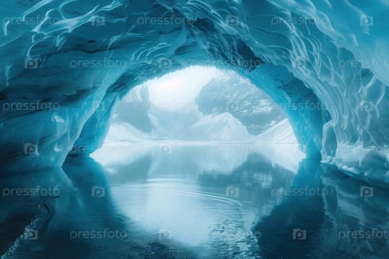 Вид изнутри ледниковой пещеры на краю высокогорного озера