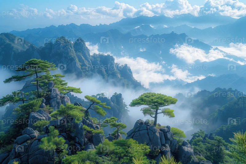 Горный пейзаж с соснами в Хуаншане, Китай