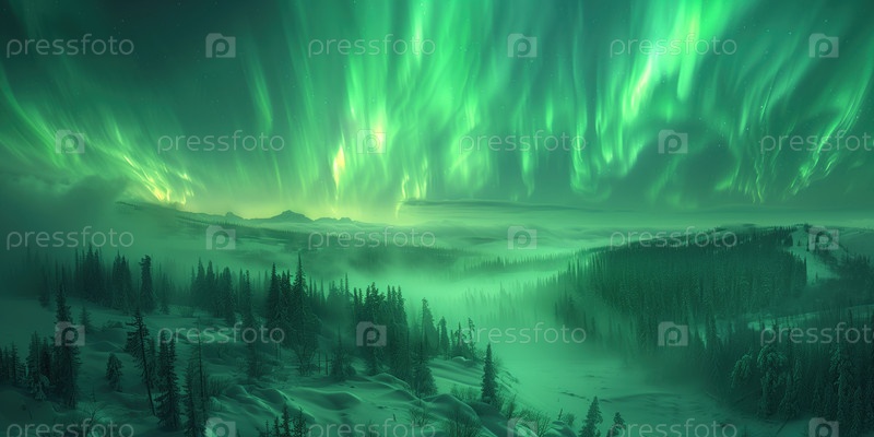 Северное сияние в небе над зимним пейзажем, вид сверху