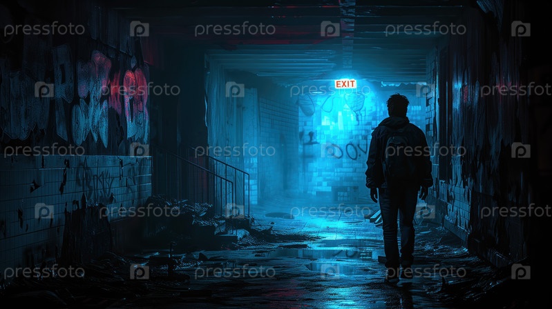 Человек в темном и мрачном подземном переходе видит надпись «выход»