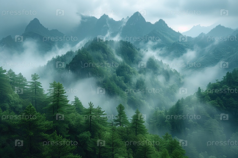 Горный пейзаж с туманом и соснами в Хуаншане, Китай