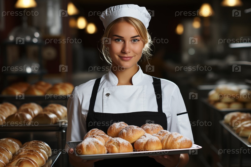 Молодая профессиональная женщина-пекарь держит поднос с булочками в пекарне