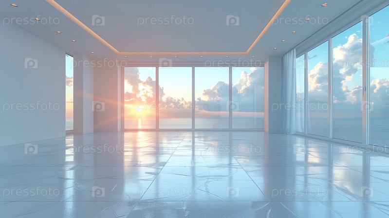 Концепция дома мечты, пустая современная комната с видом на море и рассвет за панорамными окнами