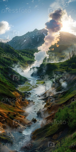 Вертикальный вид на вулканическую долину с гейзерами и термальными источниками