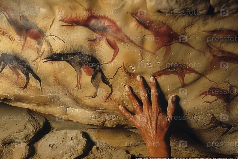 Наскальная живопись, рука коренного жителя касается древнего камня с изображенными на нем загадочными существами