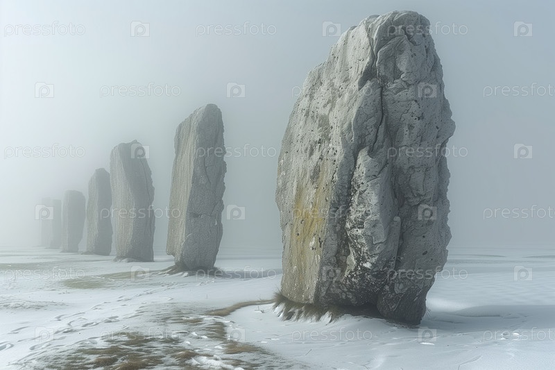 Древний мегалитический каменный ряд, выравнивание в морозный зимний день