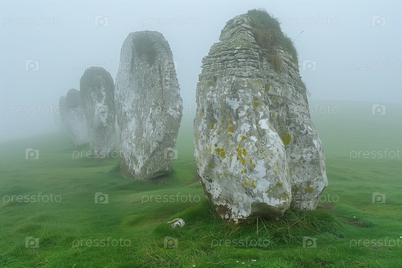 Ряд древних мегалитических камней туманным утром на лугу