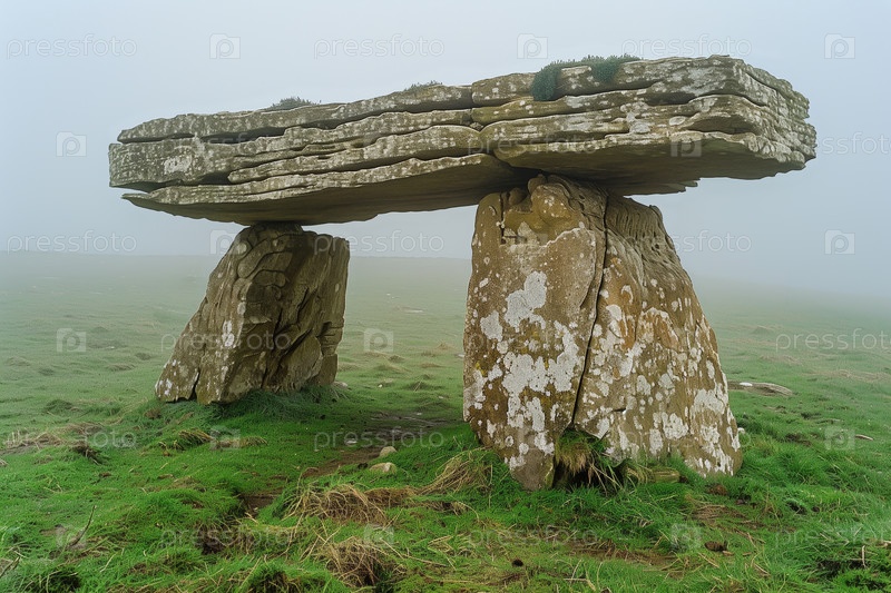 Древний мегалитический дольмен туманным утром на лугу