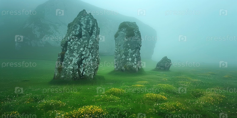 Древние мегалитические камни туманным утром на лугу в горной долине