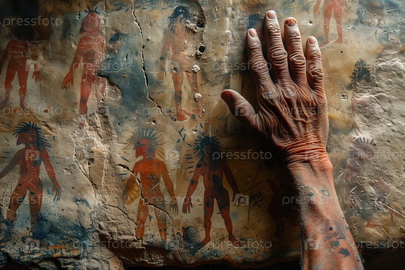 Наскальная живопись, рука коренного жителя касается древнего камня с изображенными на нем человеческими фигурами