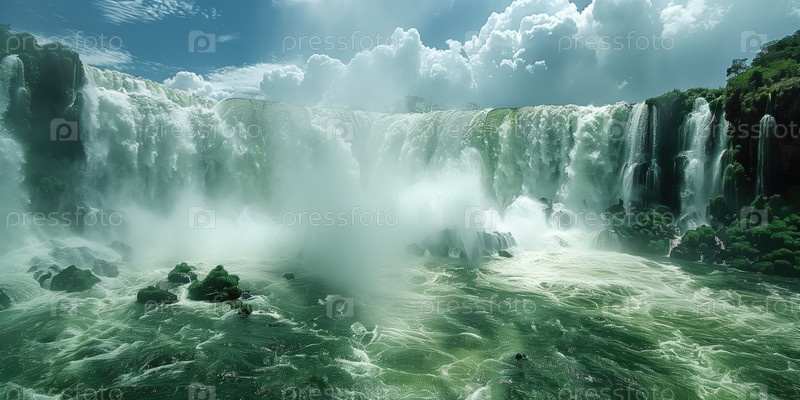 Панорамный вид на большой мощный водопад
