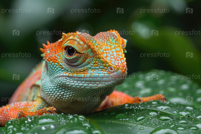 Красочный хамелеон сидит на зеленом листе в тропическом лесу