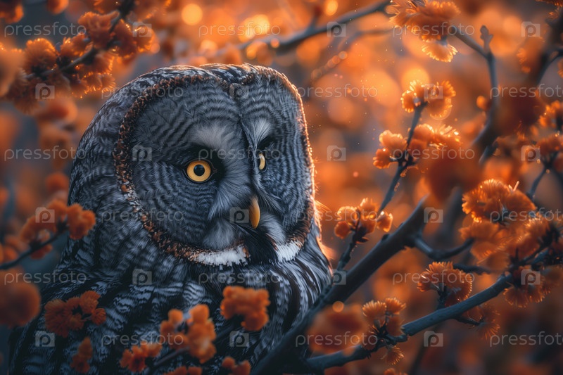 Портрет красивой совы на дереве с оранжевыми цветами