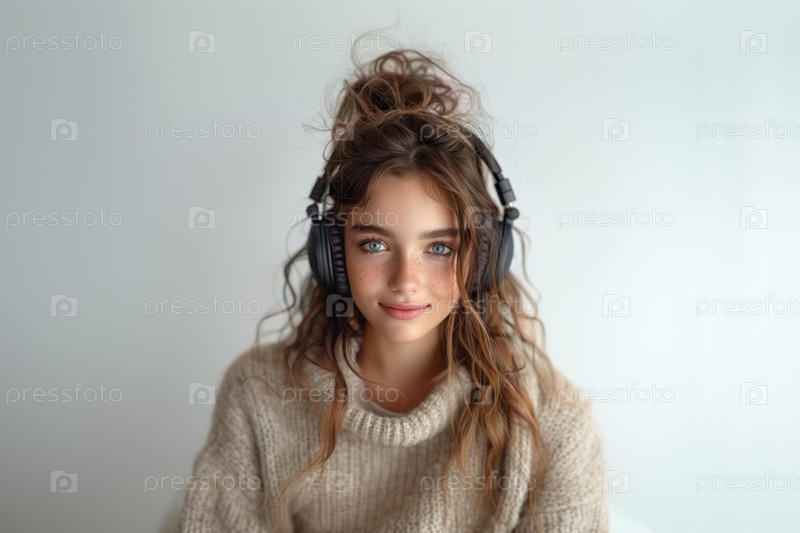 Молодая красивая женщина в наушниках слушает музыку. Портрет девушки в наушниках