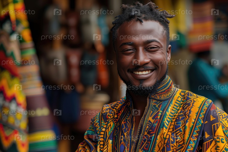Портрет улыбающегося африканца в традиционной одежде в магазине тканей на рынке