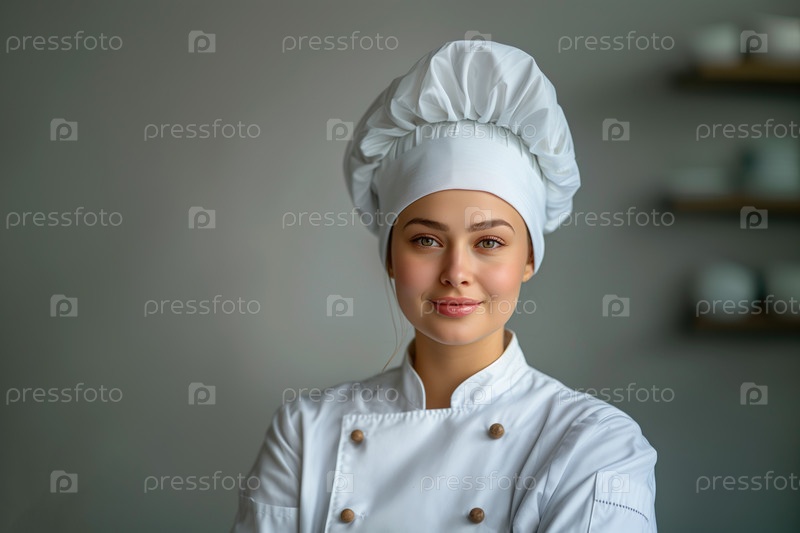 Портрет красивой женщины-повара в белой униформе на сером фоне