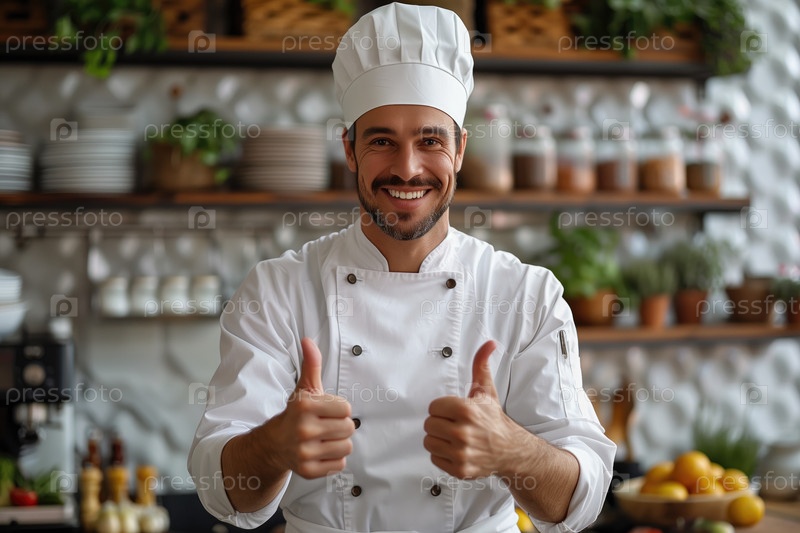 Портрет улыбающегося шеф-повара-мужчины, показывающего большой палец вверх на кухне