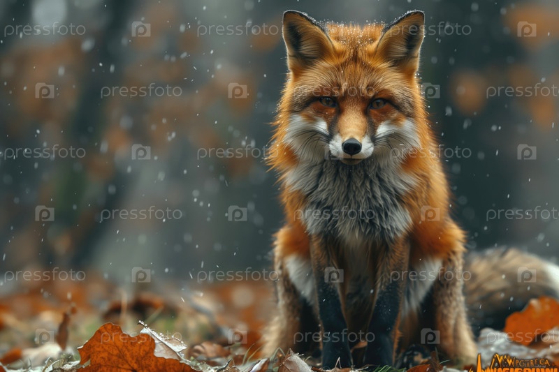 Красная лиса (Vulpes vulpes) в лесу во время снегопада