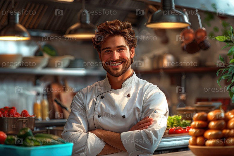 Портрет улыбающегося шеф-повара, стоящего со скрещенными руками на кухне