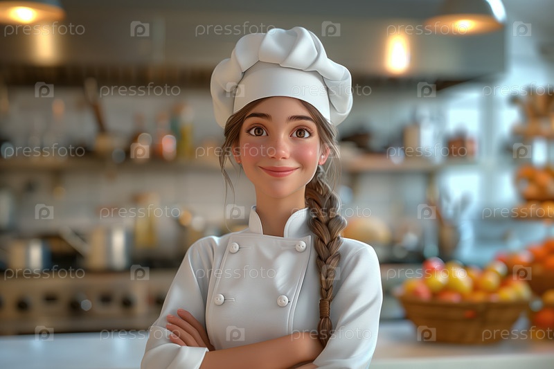 Мультяшный портрет красивой молодой женщины-повара в униформе на кухне