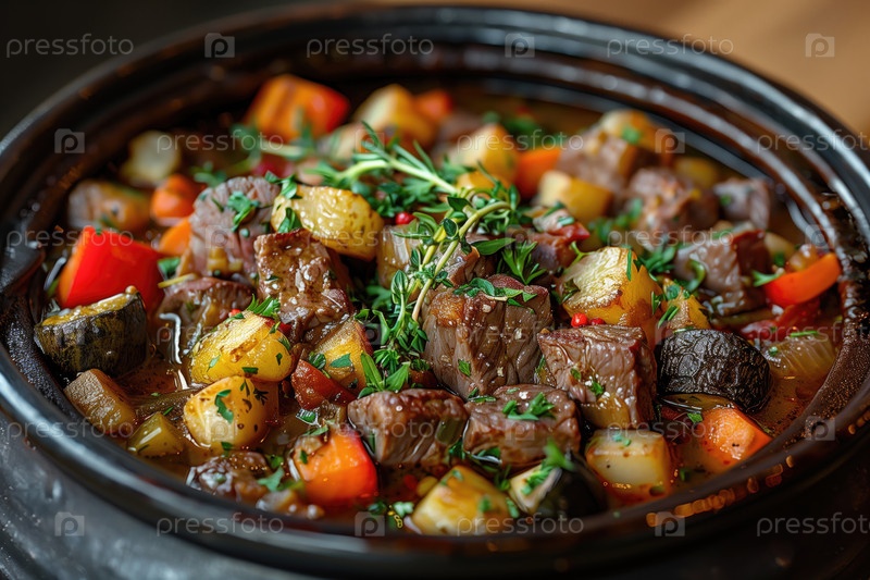 Мясо и овощи тушатся в горшочке на столе