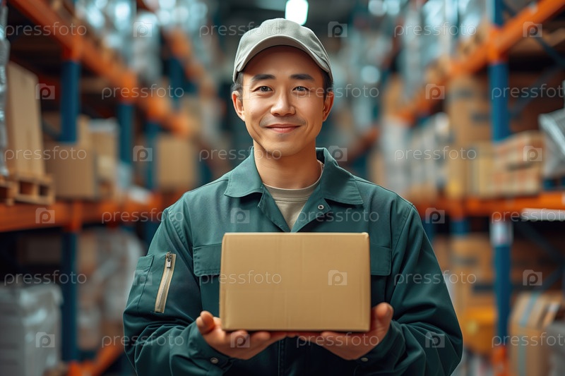 Улыбающийся азиатский мужчина-рабочий с коробкой в руках на складе