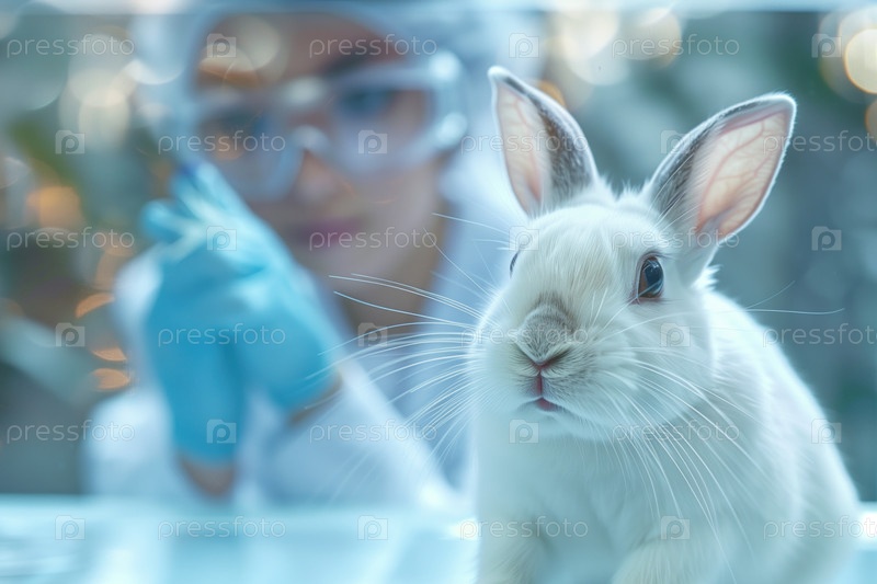 Ученый работает с кроликом в лаборатории, крупным планом. Тестирование животных