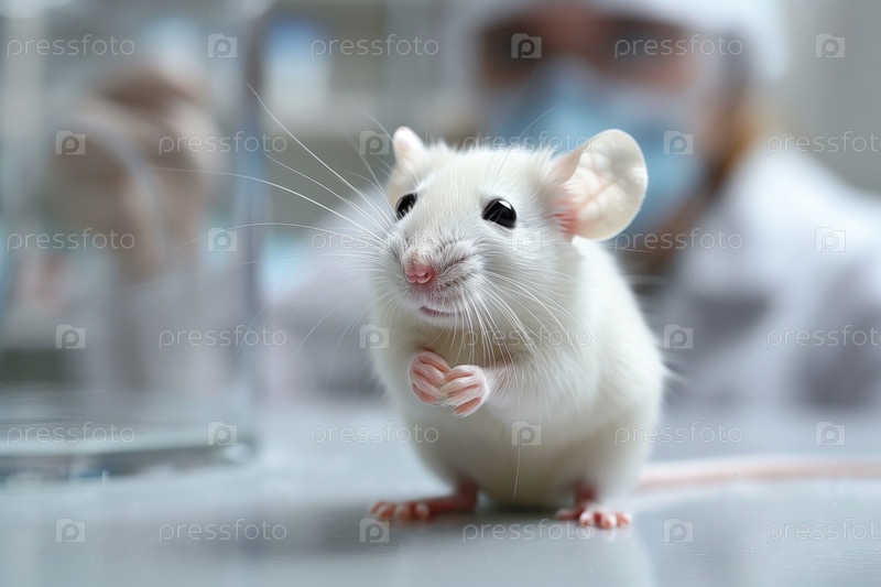 Белая лабораторная крыса сидит на столе в лаборатории, крупный план