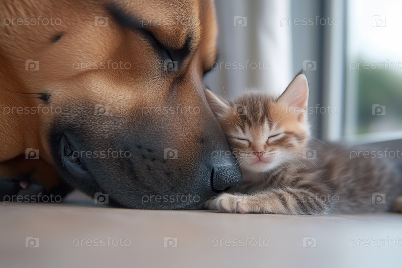 Взрослая большая собака спит с крошечным котенком на полу, выборочный фокус
