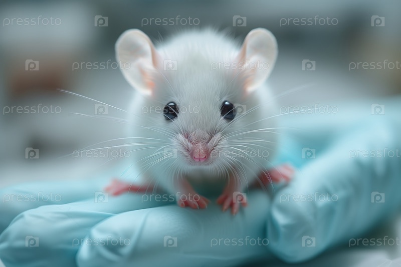 Маленькая белая мышь в руках человека в защитных латексных перчатках на размытом фоне, крупный план