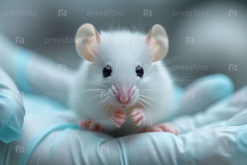 Маленькая белая мышь в руках человека в защитных латексных перчатках на размытом фоне
