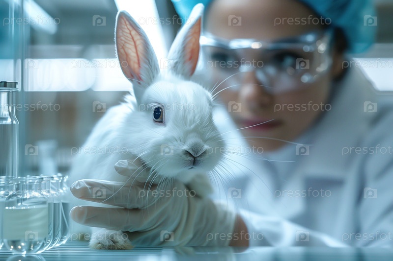 Ученый изучает кролика в лаборатории, крупным планом. Концепция биотехнологии