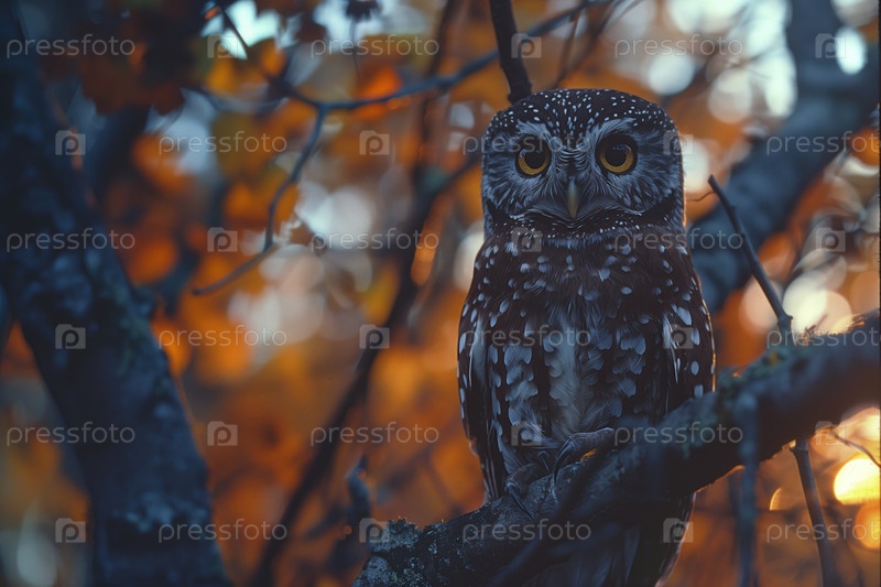 Красивая сова сидит на ветке дерева в осеннем лесу