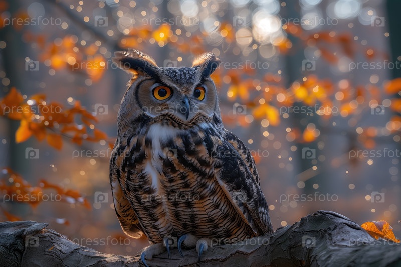 Филин (Bubo bubo) сидит на ветке в осеннем лесу