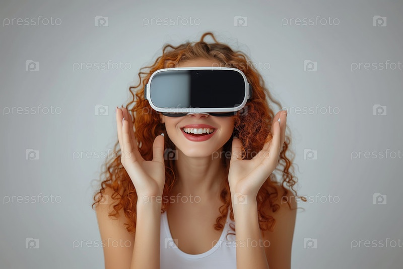 Молодая женщина в гарнитуре виртуальной реальности или 3D-очках погружается в виртуальность на футуристическом фоне