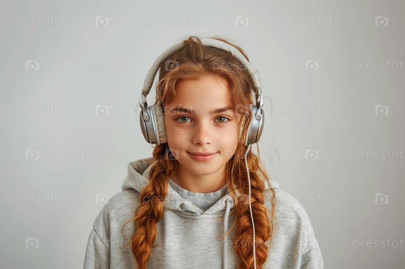 Портрет милой маленькой девочки в наушниках, слушающей музыку