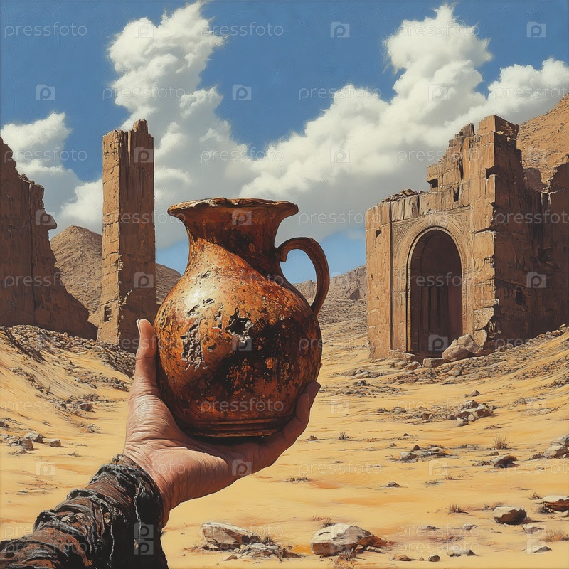 Рука держит глиняный кувшин в древних руинах в пустыне