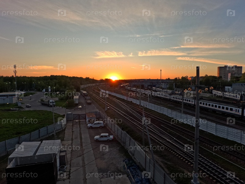 Закат на фоне решений железнодорожной инфраструктуры. закат над депо