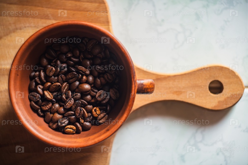 Кофейные зерна в глиняной чашке