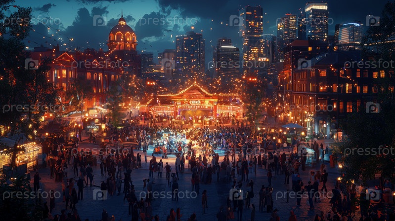 Многолюдная городская площадь, освещенная ночью светящимися огнями