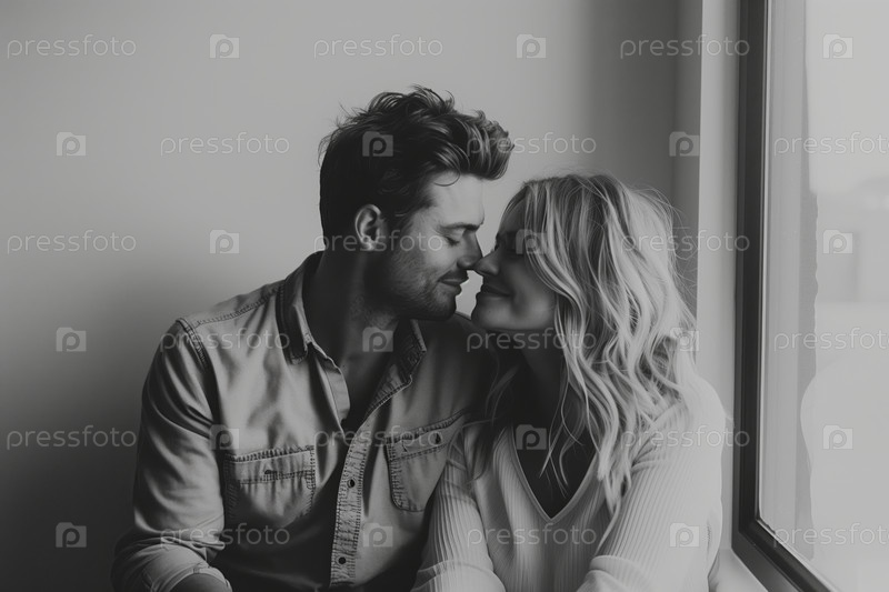 Черно-белый портрет влюбленной пары у окна