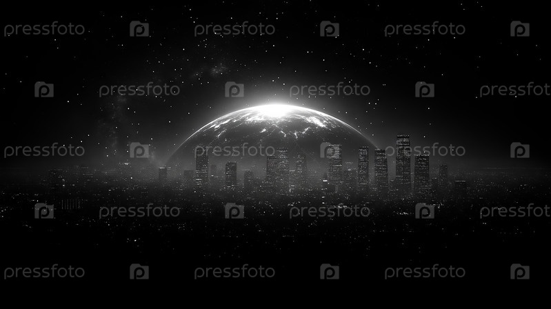 Футуристический городской пейзаж под светящейся полупланетой