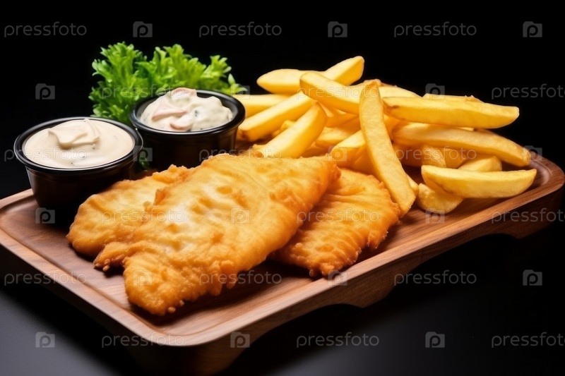 Блюдо из рыбы и чипсов на минимальной кухне. Домашняя или еда на вынос. Традиционная типичная британская еда. Картофель фри с соусом
