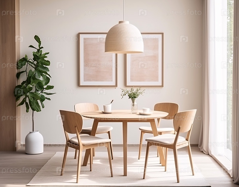 Роскошные апартаменты, комфортабельный люкс, гостиная. макет постера, круглый стол и стулья в современной столовой